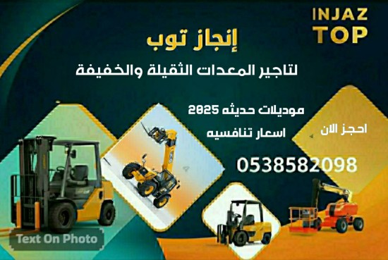 إنجاز توب لتأجير المعدات الثقيلة والخفيفة | ENJAZ TOP for Heavy & Light Equipment Rental"🏗️ إنجاز توب لتأجير المعدات الثقيلة والخفيفةENJAZ TOP for Heavy & Light Equipment Renta🚜 رافعات شوكية | Forklifts for Rentنوفر مجموعة متكاملة من الرافعات لتناسب جميع احتياجات المشاريع:We provide a full range of forklifts to suit all project needs:🔹 رافعة شوكية 3 طن – 3 Ton Forkliftمثالية للمستودعات والمواقع الصغيرةIdeal for warehouses and compact job sites🔹 رافعة شوكية 5 طن – 5 Ton Forkliftقوية وموثوقة للأعمال المتوسطةReliable and powerful for medium-duty work🔹 رافعة شوكية 7 طن – 7 Ton Forkliftأداء عالي للأعمال الشاقةHigh performance for heavy-duty operations🔹 رافعة شوكية 10 طن – 10 Ton Forkliftمصممة لرفع الأحمال الثقيلة بسهولةBuilt for handling large and heavy loads🔹 رافعة شوكية 16 طن – 16 Ton Forkliftالقوة القصوى للمشاريع الصناعية الكبرىMaximum power for large industrial projects✅ ديزل أو كهرباء – Diesel or Electric✅ تأجير يومي / أسبوعي / شهري – Daily, Weekly, Monthly Rental Options🔼 سيزر لفت | Scissor Lifts for Rentحلول آمنة وسهلة للوصول إلى الأماكن المرتفعةSafe and easy lifting solutions for elevated work🔹سيزرلفت scissorsleft 6 متر – 6m🔹 سيزرلفت 8 متر – 8m🔹 سيزرلفت 10 متر – 10m🔹سيزرلفت 12 متر – 12m🔹سيزرلفت 14 متر – 14m🔹سيزرلفت 16 متر – 16m✅ مناسب للأعمال الداخلية والخارجية – Ideal for indoor & outdoor jobs تليهاندر (مرلو – جي سي بي) | Telehandler (Merlo / JCB)قدرة رفع تصل إلى 17 متر – Lifting height up to 17mأداء قوي وثبات في جميع التضاريسStrong performance and stability on all terrains---مان لفت | Man Liftللعمل في الأماكن المرتفعة بأمان تامSafe and efficient access to high work areasارتفاعات تبدأ من 12 متر إلى 20 متر – Heights from 12m to 20m- نغطي جميع مناطق المملكة العربية السعوديةServing all regions of Saudi Arabia📞 0538582098💬 معدات جاهزة – خدمة سريعة – أسعار منافسة💬 Ready Equipment – Fast Service – Competitive Pric