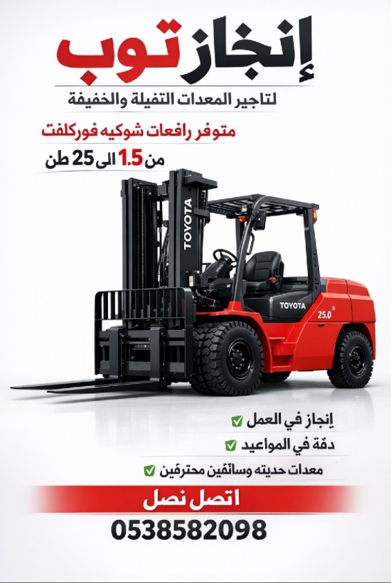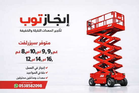إنجاز توب للتاجير المعدات الثقيله والخفيفه - الرياضمؤسسة إنجاز توب لتأجير رافعات شوكية للإيجار في الرياض-سيز لفت – الرياضهل تبحث عن معدات رفع ثقيلة موثوقة لإنجاز مشاريعك؟إنجاز توب لتأجير المعدات الثقيلة توفر لك كل أنواع المعدات بأعلى جودة وأفضل سعر:???? رافعات شوكية (فوركلفت)???? سيزر لفت (Scissor Lift)???? مان لفت (Man Lift)???? كرينات هيدروليكية???? بوم لفت (Boom Lift)???? لودرات، حفارات، جرافات???? سطحات نقل، مولدات كهرباء، كمبروسرات هواء✅ تأجير يومي، أسبوعي، شهري✅ تغطية شاملة لجميع مناطق السعودية✅ معدات حديثة وصيانة دورية✅ خدمة عملاء الرافعات الشوكيه والتليسكوبيه والكرينات. السيزرات وجميع انواع واحجام المعدات. وذلك تاجيرسنوي