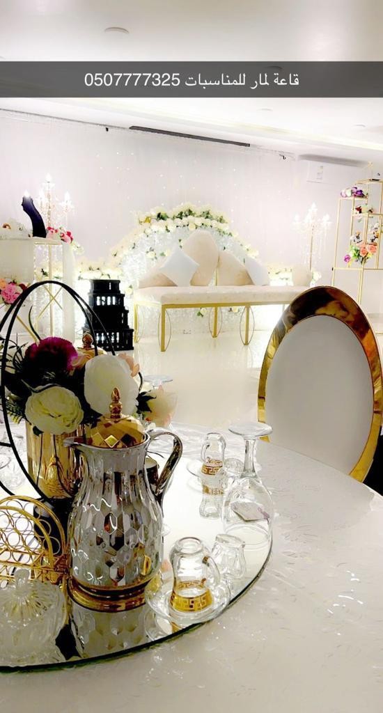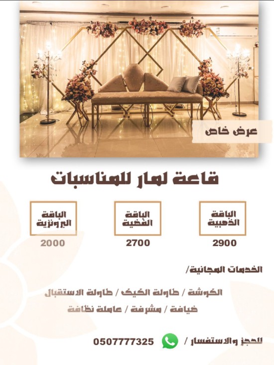 شرح الباقات البرونزيه بس القاعه الفضيه القاعه و الكوشه اوو تختارو بدل الكوشه الضيافه يعني وحده منهم الذهبيه القاعه مع الكوشه مع الضيافه. ان المناسبات الي نستقبلها هي١-مناسبات عقد قران او خطوبه نسائيه٢- حفلات تخرج روضات اطفال للجنسين٣-اجتماعات رجاليه لشركات عقد قران رجاليه ٤- احتفالات اعياد الميلاد العائليه٥- احتفالات الجلواتويوجد توفير الوجبات للمناسبات حسب الطلب العملاء